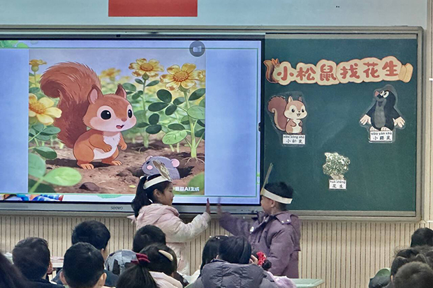 活动伊始,薛家实验小学高亚莉老师献上一堂精彩纷呈的幼小衔接展示课《小松鼠找花生》。课堂以巧思谜语开篇,瞬间唤醒孩子们的探索欲与好奇心;随后,孩子们头戴特色头饰,化身故事中的小松鼠、小鼹鼠,沉浸式演绎经典情节,在肢体表达与情感共鸣中深度解构文本内涵。课堂延伸环节的豆豆本创作更是亮点纷呈,学生们通过小组合作的方式,围绕 “花生的一生”“故事重现”“土里的宝贝”等多元主题匠心创作,将文本阅读延伸至生活观察与创意实践,让学习兴趣在具象化表达中持续升华,实现了从文本感知到生活探索的有机衔接。