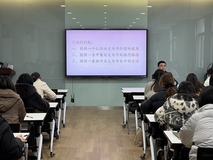 潘博士指出,教研写作不仅是职称评审的“加分项”,更是教师构建个人专业知识体系、实现自我迭代的重要载体。他鼓励教师将课堂中的真实问题与教学智慧转化为文字,在写作中推动教学反思与知识建构。讲座中,潘博士系统阐述了“UCTSPP”写作路径,并结合生动课例,拆解论文撰写的实践逻辑,强调“好论文从课堂中来”。他还为英语教师提出了从文本解读到教学转化的六步实践体系,并寄语青年教师要着力培养“问题意识、理论意识、结构意识、读者意识、规范意识”,让写作真正服务于教学成长。