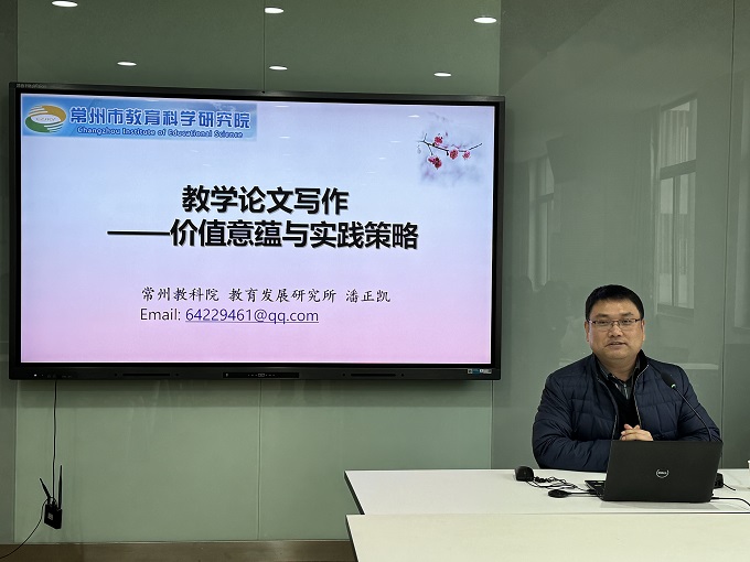 本次活动特邀常州市教科院教育改革发展研究所副所长、教育博士、正高级教师潘正凯博士作专题指导。潘博士结合自身从乡村到名校的多元教学经历,以及深厚的教研写作积淀,开展了题为《教研写作的价值意蕴和实践策略》的讲座。