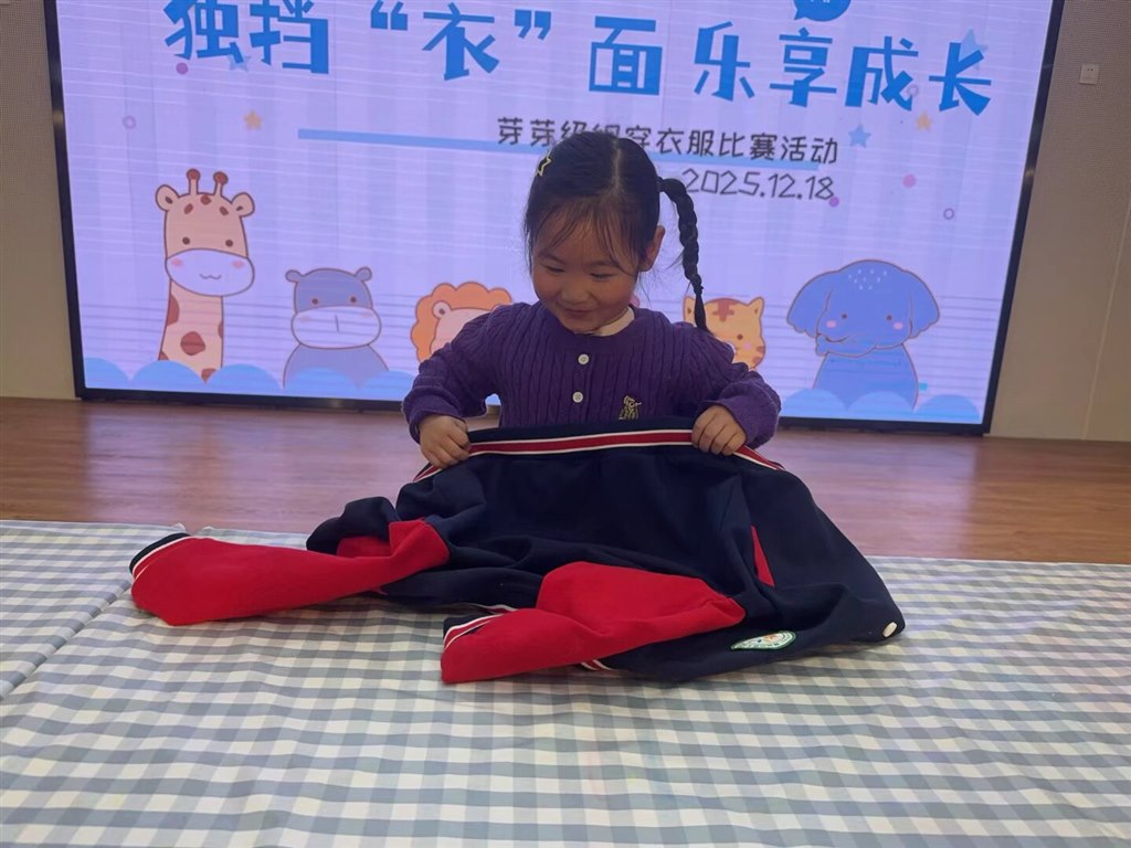 通过本次“独挡‘衣’面 乐享成长”活动,孩子们在欢笑中解锁新技能,在挑战中收获大成长,用行动诠释了“生活即教育”的真谛!穿衣比赛虽已结束,但宝贝们的独立之旅刚刚启程!未来的日子里,期待小班萌娃们继续勇闯“生活技能小关卡”,学会扣纽扣、叠衣衫、系鞋带……让每一天都成为“自理小达人”的闪耀时刻!(撰写:张英 拍摄:钱凯丽 审核:蒋薇)