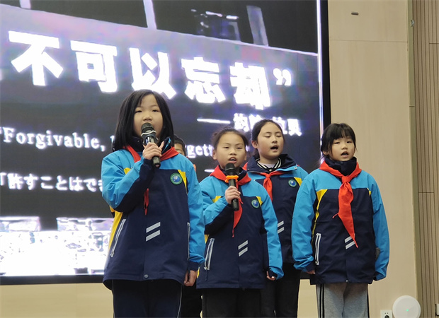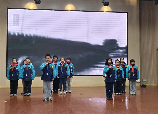 升旗仪式后,四(4)中队的队员们缓步走上台,开始了主题为《历史的回响,青春的回声》的朗诵。他们身着整洁的校服,神情庄重而明亮。清澈的童声如溪流般流淌在宁静的校园中,字句间既有对历史的深沉回望,也有对未来的热切期盼。“历史是镜子,照亮前行的路;青春是火炬,点燃希望的光……”朗诵虽简洁,却在平实的语言中传递出厚重的情感,展现了新时代少年对历史的尊重、对和平的珍视,以及奋发向上的精神风貌。
