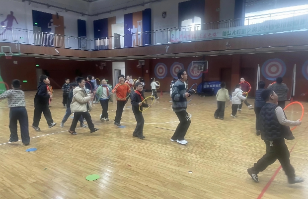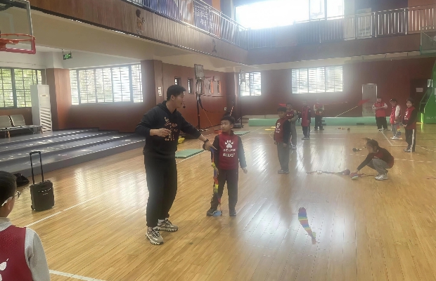 彩带飘飘,欢笑四溢。在我校室内运动场中,李纪凯老师执教的二年级体育课《抛接与游戏》正火热开展。课堂以“健康第一”为引领,融合“学练赛一体化”模式,孩子们手持色彩鲜艳的彩带球,在“抛接秘诀”中唤醒身体,在“创意姿势挑战”中释放活力。随着“捣蛋鬼游戏”的开展,课堂气氛逐渐升温——四人一组,三人传接,一人拦截,笑声与呐喊交织,眼神与彩球齐飞。最后的“4VS4团队赛”将课堂推向高潮,孩子们在奔跑、传递、欢呼中,不仅熟练掌握了“抛得准、接得稳”的核心技能,更在协作中学会了沟通,在规则中懂得了尊重。这堂课,是技能的锤炼,更是品格与情感的生动塑造,展现了“以体育人”的生动实践。
