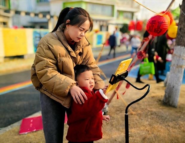 民俗游乐坊仿佛一条时光纽带,将两代人的童年记忆紧紧相连。“小马套圈”“祥龙飞环”“萌虎射福桩”……这些经典游戏,是家长记忆深处的宝藏,也是孩子新奇有趣的探索。亲子共同感受跳绳的喜悦、跳皮筋的快乐、两人三足的协同。传统的快乐在代际间自然传递,这份在共同游戏中流淌的温情,让文化的传承有了温度,让新年的团聚有了更深的意义。