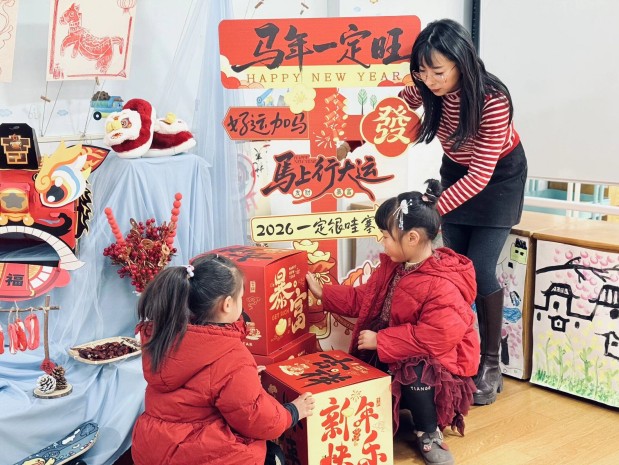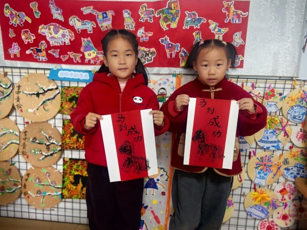 当《新年好》的歌曲声响起,国宾幼儿园大班的孩子们正以一场特别的“骏马”主题打卡活动迎接新年的到来。每个班级变成充满传统文化韵味的“小马场”,孩子们的笑声与“马蹄声”交织,趣味与挑战并存的文化体验悄然展开。