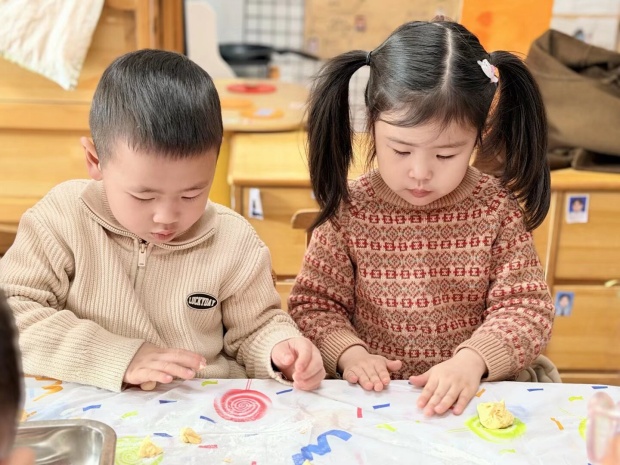 巧手揉捏,五彩馒头蕴吉祥。活动在上午的“包五彩馒头”中拉开帷幕。小班的孩子们洗净小手,化身小小面点师,围坐在桌前。老师们准备了健康果蔬汁染就的彩色面团,红的喜庆,绿的生机,黄的灿烂。在老师的耐心指导下,孩子们兴致勃勃地揉、捏、搓、团,将天马行空的想象赋予手中小小的面团。不一会儿,憨态可掬的小动物、圆润饱满的元宝、绽放的花朵等造型各异的“创意馒头”便诞生了。这不仅是一场美食制作,更是一次感官与创造力的唤醒,孩子们在揉捏中感受着劳动的快乐,也悄然领悟着新年“蒸蒸日上”的美好寓意。