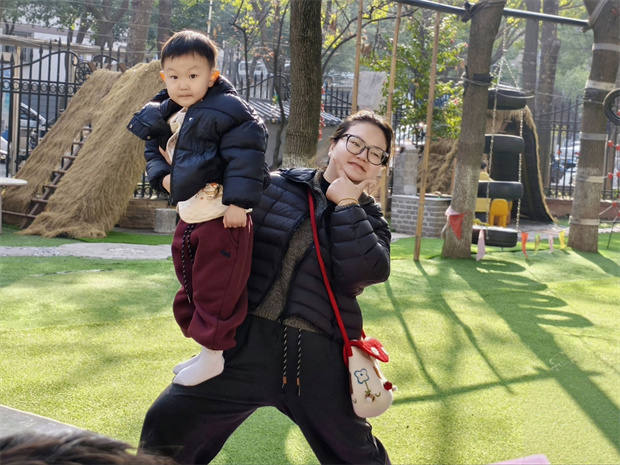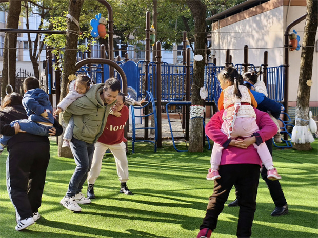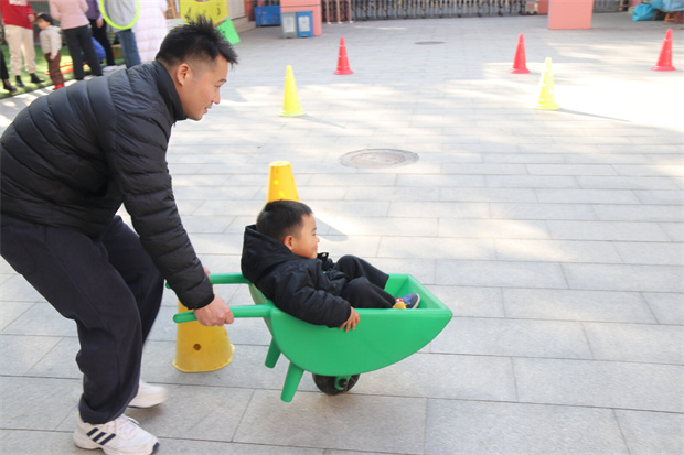 在欢快的运动场上,“超人运宝车”率先出发,家长推着载娃小车穿越障碍,展现速度与平衡;“圈圈背娃大冒险”紧随其后,家长背负孩子完成套圈跳跃,默契值瞬间拉满。紧接着,“螃蟹赛跑”带来阵阵欢笑,亲子手脚并用横向移动,憨态可掬;“接力跳圈”则传递着协作的节奏,在跳跃中感受团队的力量。随后的“亲子瑜伽”让气氛温柔下来,共同舒展身体、增进柔韧。“揪尾巴”环节再度点燃热情,亲子在追逐躲闪间锻炼反应;“你抛我接”则考验手眼协调,每一次抛接都是信任的传递。最后,“小蚂蚁运球”以趣味爬行收尾,而新增的“齐头并进”绑腿同行与“夹娃娃”精细挑战,更让整场运动会在协调与耐心中共绘出“1+1>2”的温暖画面。