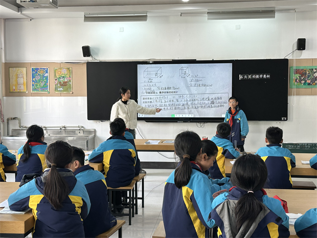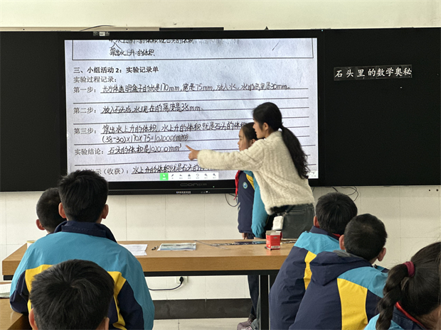 付应华老师执教了一节《石头里的数学奥秘》。课堂伊始,付应华老师以校园“灵溪节”为情境,抛出驱动性问题:“形态各异的石头,体积该如何测量?”学生从熟悉的长方体体积计算跃入不规则世界的挑战,认知冲突自然生成。