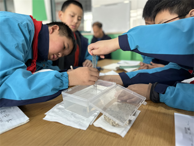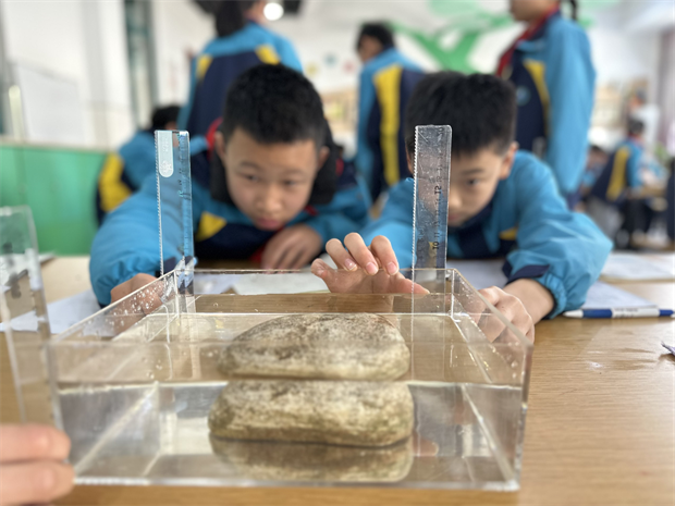 探究环节,各小组化身为小小实验团队。他们有序分工,谨慎测量容器内壁尺寸,专注记录初始水面刻度。当石头被轻轻浸入水中,水面缓缓上升的刹那,真实的“体积转化”在眼前发生。学生通过测量、记录、计算,亲身推导出“石头的体积=上升部分水的体积”这一核心结论。整个过程中,付老师穿行于各组之间,适时追问“为何要从里面量?”“不完全浸没会怎样?”,引导思考走向深处。一道“鱼缸中的鹅卵石”实际问题,一次“测量鸡蛋体积”的生活化作业,将课堂所学稳稳锚定于真实世界。