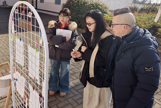 室外活动区热闹非凡。“易错字音闯关”游戏成为全场焦点。学生、家长与来宾先后应战,面对精心设计的汉字读音、字形难题,大家时而低声讨论,时而凝神思索,闯关成功后的欢呼声此起彼伏。书法展示区墨香四溢,师生代表挥毫泼墨,硬笔书法笔锋刚劲,软笔书法行云流水,一幅幅春联、一个个福字饱含美好期许。现场的兑奖环节更是人气高涨,教师亲手书写的作品作为纪念品赠送给每一位参与者,意义非凡。