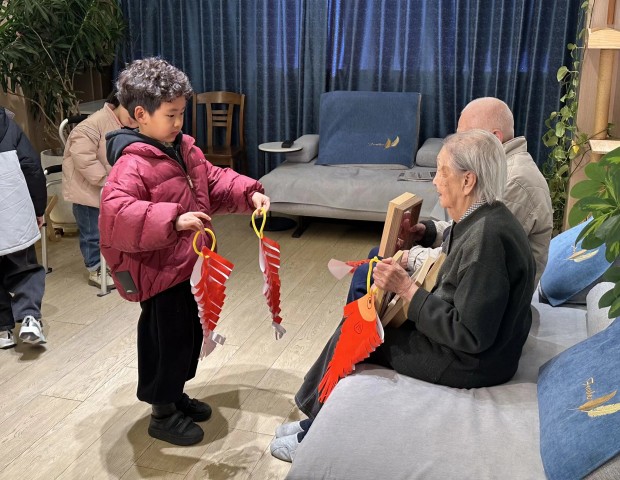 随后,小朋友拿出亲手制作的手工作品鱼和剪纸——鱼寓意年年有余、福寿安康,剪纸凝聚着耐心与用心,虽不昂贵却承载满满心意。他们将礼物递到老人手中,用软糯的声音说:“爷爷奶奶,祝您们身体健康。”简单话语里是最纯粹的祝福。