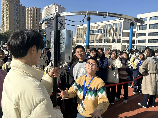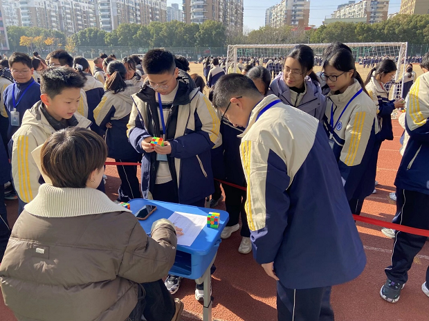 操场另一侧的活动区域同样人气高涨,手脑并用的“精敏挑战区”趣味十足,学生们借助触电鸣叫设备与光电感应靶位,将神经反应速度、手眼协调能力的训练,变成了一场场紧张刺激的闯关比拼,在欢声笑语中感受科技魅力。魔方社团的展示区更是高潮迭起,同学们指尖翻飞、色块疾转,在分秒必争的竞速挑战里,展现着超凡的空间思维与记忆策略,每一次精准归位都引来现场阵阵欢呼。