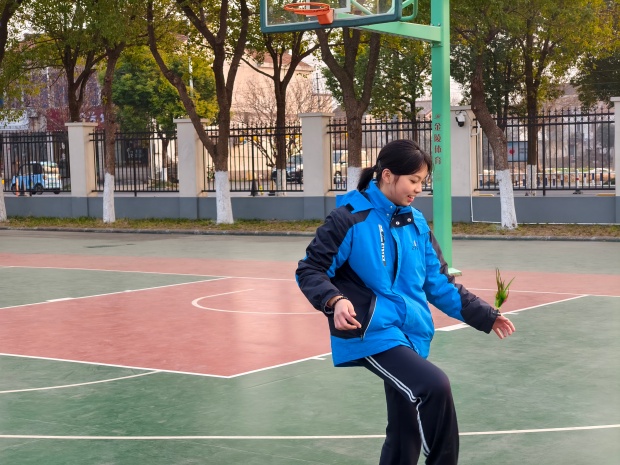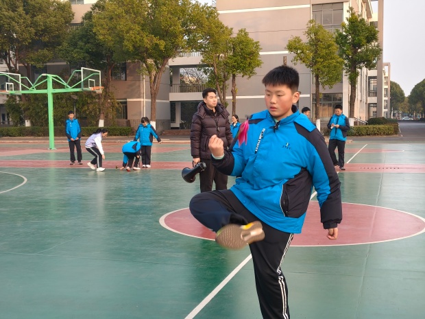 踢毽子赛场则更加花样繁多。有的同学用脚内侧轻巧托送,毽子如蝴蝶翻飞;有的同学跳跃侧踢,身影和毽子共同起舞;同学们的表现引得观众连连喝彩。寒风吹过,毽子调皮地飞走,同学们却毫不放弃、紧追不舍,势必用青春点燃严寒。