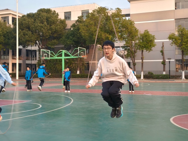 “预备——开始!”随着裁判一声哨响,个人跳绳比赛率先展开。同学们双脚如安了弹簧,手腕轻抖间,跳绳在空中划出银色弧线,单摇敏捷迅速,双摇刚柔并济,都展现了同学们的风采。而考验团队协作的“8字长绳”项目更是精彩纷呈,参赛的12名队员默契配合,如灵巧的燕子穿梭其间。