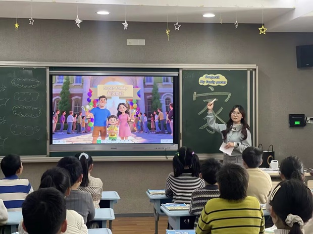 理论学习之后,活动进入课堂实践展示环节,叶露与陆如蓝两位老师先后带来精彩的复习课展示。叶露老师以“超级家庭日”竞赛为情境主线,紧扣复习课核心目标,通过自然拼读专项复习、单元核心句型自由对话等环节,系统激活学生已学知识储备;同时设计“勾选基础知识点—制作复习海报—展示复习成果—互评提升”的分层任务链,引导学生在实践中梳理单元重点,用英语规范表达家人信息与家庭相关能力,实现知识的巩固与运用。陆如蓝老师则创设“家风馆”大情境,以家庭主题歌曲导入后,巧妙融合跨语文学科元素与中华传统文化家风内涵,引导学生将“尊老爱幼”“互帮互助”等家风精神融入英语表达,在绘制带有家风元素的家庭海报、分享家风故事与复习收获的过程中,既系统夯实了单元基础,提升了语言综合运用能力,又深化了对中华优秀传统家风的理解。两节课虽设计思路各异,但均紧扣复习课教学核心,精准落实“夯实基础、提升能力”的复习目标,为复习课的多样化设计提供了实践范例。