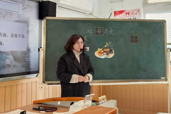 随后,金香丹老师带来三年级文言文入门课《司马光》。针对文言文教学难点,金老师以“初识古文、读懂故事、感悟品质”为目标,层层递进开展教学。她引导学生对比文言与现代文差异,通过标注停顿、反复诵读感受文言韵律;结合插图与注释解读字词,助力学生理解课文大意。同时,鼓励学生自主探究、合作交流,梳理故事情节,感悟司马光沉着机智的品质,既传授了文言文学习方法,又渗透了传统文化教育。