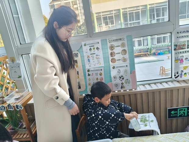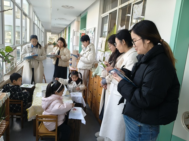 上午,课题组成员先走进中三班,实地观摩陶莹老师组织的工艺区域游戏活动。观摩过程中,老师们聚焦“区域材料、支架与环境的适宜性”“幼儿工艺活动中的发展状态”“教师支持策略的有效性”三大核心问题,细致观察幼儿的操作行为、互动表现,认真记录教师的指导时机与方法,为后续研讨收集了鲜活的实践素材。中三班丰富的工艺材料投放、贴合幼儿年龄特点的环境创设,以及教师精准地介入指导,给在场课题组成员留下了深刻印象。