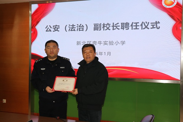 为进一步强化校园法治教育,筑牢校园安全防线,1月15日下午,奔牛实验小学隆重举行公安(法治)副校长聘任仪式,正式聘请奔牛派出所副所长龚超担任学校法治副校长。奔牛实验小学校长杨文荣、关工委常务副主任张伟强及学生中心全体成员出席仪式。