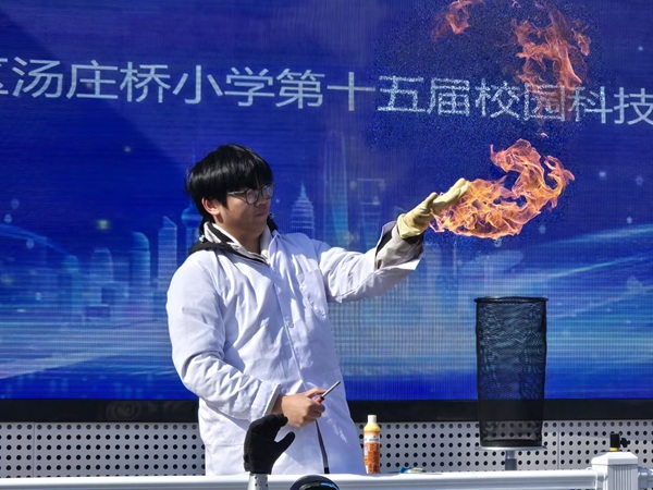 最令人期待的科技秀展演环节,将现场气氛推向高潮。伴随着激昂的音乐,科技辅导员为全体学生带来了一场精彩纷呈的科学盛宴。空气大炮“砰”然作响,喷出的环形气浪引得同学们阵阵惊呼;趣味十足的“火云掌”实验,志愿者手中燃起的蓝色火焰神奇不灭,让同学们瞪大好奇的眼睛,纷纷前倾身子一探究竟;机器人向同学们热情挥手,机器狗随着节奏灵巧舞动,展现出智能科技的灵动与温度,引发现场阵阵欢呼。