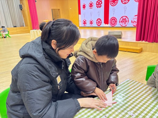 活动伊始,赵晓丽园长发表新年寄语,回顾本学期家长学校的点滴成长与丰硕收获,寄语家园以爱为帆、携手同行,“一马当先陪伴孩子奔向更明亮的未来”,温暖有力的话语赢得现场阵阵掌声。同时幼儿园为每组家庭精心准备了寓意平安团圆的新年福礼,园长妈妈亲手将福礼送到亲子手中,随后大家移步舞台合影,定格此刻圆满。接着,李亦初小朋友的妈妈与主持人丰玉洁老师联袂讲述年的传说,从年兽典故到团圆习俗,让传统文化的种子悄然扎根童心。最后,孙紫凌老师化身文化向导,细致讲解窗花渊源与剪纸技巧,亲子携手裁剪红纸,形态各异的窗花纷纷成型,现场化作一片欢乐的红色海洋。