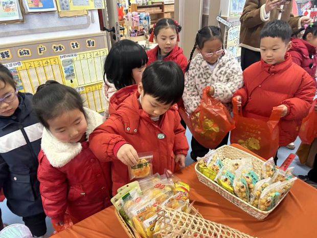 走廊上的年货集市正式开市,各类零食、小物件整齐陈列。孩子们手持购物袋自主挑选,开启快乐时光。在互动中体验赶集乐趣,分享美食与喜悦,让年味在欢声笑语中愈发浓厚。