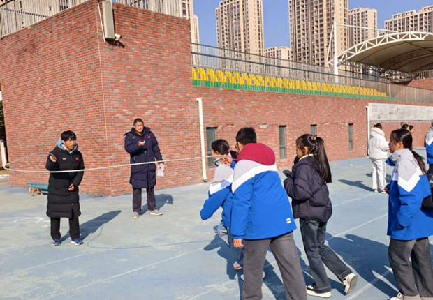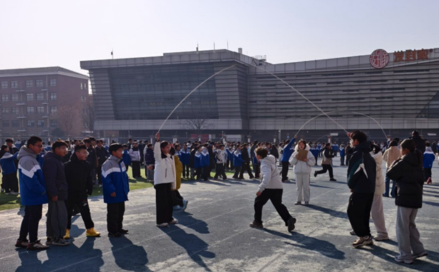 “各就各位,预备——开始!”随着裁判老师一声令下,跳长绳比赛正式拉开帷幕。赛场上,各班队员迅速进入状态,摇绳的同学紧握绳柄,手臂匀速摆动,长绳如彩虹般上下翻飞,划出一道道优美的弧线,“呼呼”的绳风声响彻操场;跳绳的同学排着整齐的队伍,踏着节奏、轻盈起跳,身影在绳圈中灵活穿梭,动作连贯流畅、整齐划一,“一二三四……”整齐的口号与绳风声、跳跃声交织在一起,成为冬日校园里最动听的旋律。有的班级凭借娴熟的技巧,跳跃速度越来越快,失误次数极少;有的班级即便出现失误,也能迅速调整状态,重新投入比赛,不气馁、不放弃,用坚持诠释着青春的韧劲。
