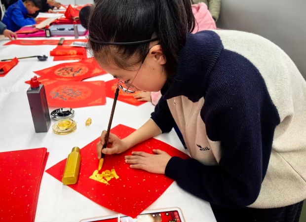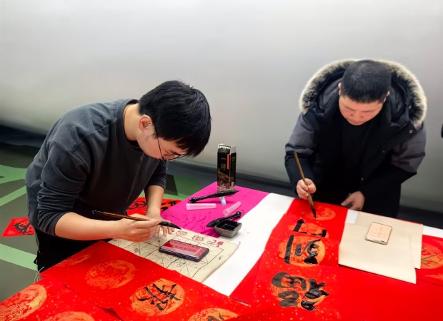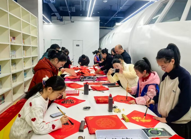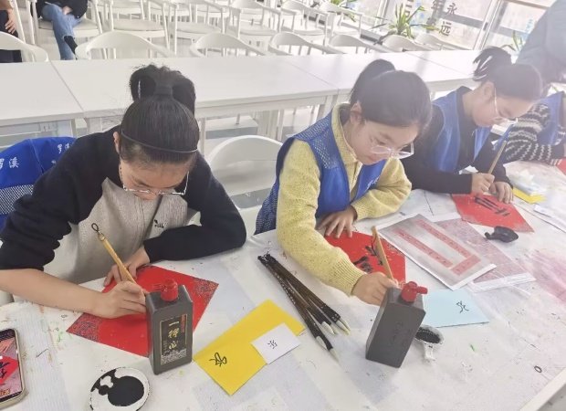 活动现场,阳光如同金色的丝线,轻柔地洒落在每一个角落,将整个场地装点得格外温馨而热闹。一张张古朴的四方长桌整齐排列,宛如等待检阅的士兵。桌上,那一沓沓精心折好的红彤彤对联纸,宛如燃烧的火焰,瞬间点燃了现场的节日氛围,让人仿佛提前置身于新年的欢乐海洋。
