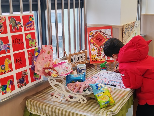 小班的孩子们满怀期待参与抽盲盒活动,未知的惊喜让小脸上写满好奇与兴奋,每一次开启都伴随着阵阵欢呼,简单的快乐填满了童年时光。中班幼儿则专注于马年主题拼图,在动手拼搭的过程中,不仅锻炼了手眼协调能力,更感受着马年带来的美好寓意。大班的孩子们拿起画笔,认真地画一封写给自己的信,用稚嫩的笔触写下心愿、画出期待,留下独属于新学期的珍贵纪念。