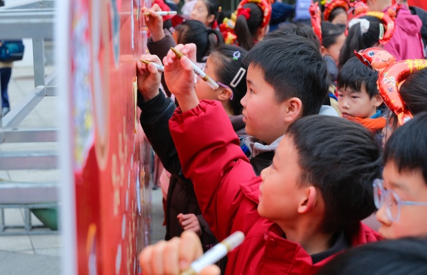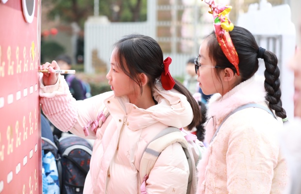 身着喜庆红衣的孩子踮起脚尖,专注地为小马添上斑斓色彩;扎着马尾、戴着发饰的女生相互配合,一笔一划勾勒心中的美好;低年级的小萌娃在家长和老师的陪伴下,认真完成属于自己的创作,稚嫩的笔触里满是对新学期的憧憬。每完成一幅创作,孩子们便会大声喊出自己的新年愿望,“龙马精神”“学业进步”“天天向上”的童声此起彼伏,在广场上空久久回荡。