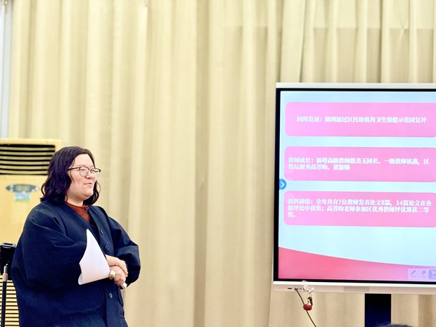 随后,杭燕副园长以“步履深耕蕴教育 同心致远绘新篇”为主题作园务工作总结讲话。她从教育教学创新、幼儿成长发展、师资队伍建设、后勤服务保障等多个维度,全面梳理了本学年的工作亮点与成效,客观分析了存在的不足,并对下一阶段的工作方向作出明确规划。详实的数据、生动的案例,让在场教职工清晰地感受到幼儿园的稳步发展,也进一步凝聚了携手前行的共识与力量。