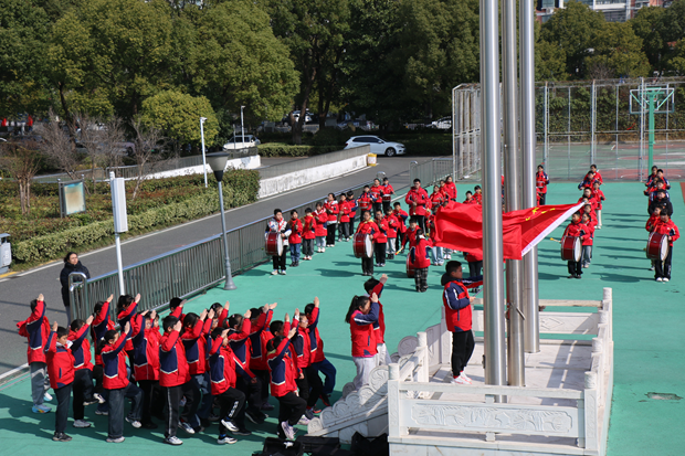 开学典礼在庄严的升旗仪式中正式拉开帷幕。在护旗队的护卫下,五星红旗迎着春风冉冉升起,雄壮的国歌响彻校园上空。全校师生肃立注目,目光中满是对祖国的崇敬与热爱,更饱含着对新学期的憧憬与期待。鼓号队声声激荡人心,为新学期的开始增添了庄重而热烈的氛围。