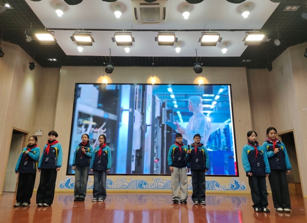 少年声浪,筑梦强国。六 (1)中队的 8 名少先队员登台献艺,带来诗朗诵《中国梦,科技梦》。他们以清脆嘹亮的嗓音、铿锵有力的语调,诉说着对祖国的赤诚热爱,抒发着对科技的无限向往,将个人的小小梦想,深深融入民族复兴的伟大征程。真挚的情感、蓬勃的朝气,感染着现场的每一个人,让 “科技筑梦、强国有我” 的信念在校园里悄然生根,让强国之志的种子在童心深处静静发芽。