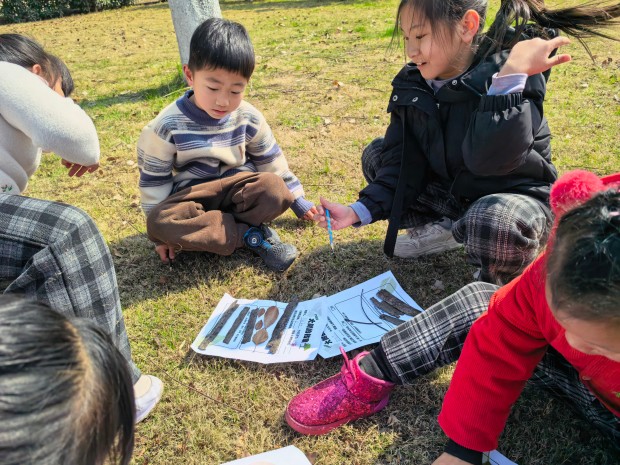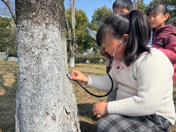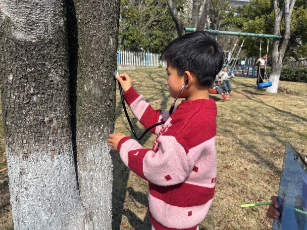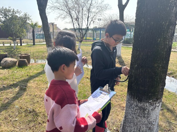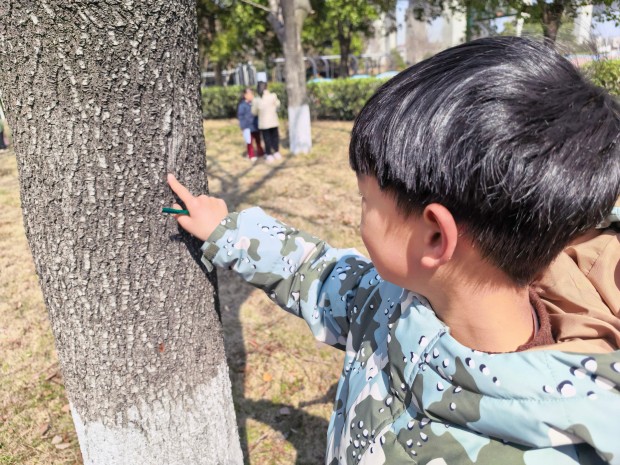 二年级的小朋友们化身“大树小卫士”,开启了与大树的亲密互动。在老师的带领下,他们轻轻贴近树干,用耳朵倾听大树的心跳,认真聆听树木生长的声音,仿佛能听到嫩芽破土的悄悄话;随后,他们伸出小手,小心翼翼地触摸粗糙的树皮,感受大树历经风雨的印记,有的小朋友还忍不住轻轻抚摸,温柔地和大树打招呼;小朋友们运用数学课上学习的“身体尺”,用小小的臂膀和手掌丈量大树的身围,许下了守护绿色的美好心愿,脸上洋溢着纯真的笑容。