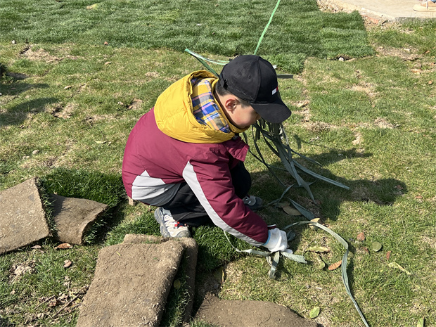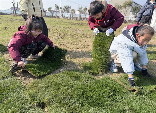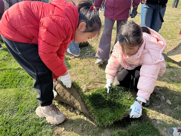 随即孩子们化身 “护绿小使者”,为草地穿上绿衣。弯腰俯身,小心翼翼地将草皮铺在树苗周围的空地上,用小手抚平边角,再轻轻按压,让草皮与泥土紧密贴合。