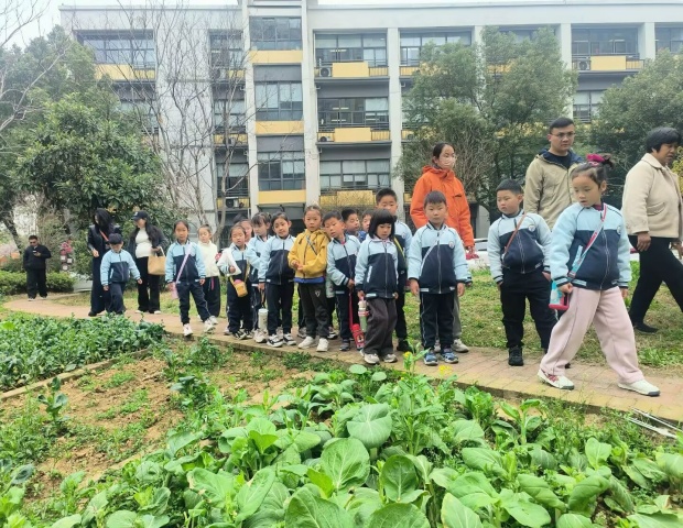迎着花香,孩子们身着统一园服、头戴小黄帽,在老师和家长助教的陪同下,迈着欢快的步伐来到香槟湖小学西门集合,满怀期待地开启这场 “小学探索之旅”的沉浸式体验。在香槟湖小学教师和六年级小导游的带领下,孩子们沿着童玩天地 — 果蔬园 — 图书馆 — 乐高墙 — 秘密花园 — 香槟号列车 — 攀岩墙的路线有序参观校园。一路上,孩子们睁着好奇的眼睛,认真聆听小导游的讲解,不时发出惊叹,对小学丰富的校园设施和优美的环境充满向往,一个个小脑袋里满是对小学生活的憧憬。