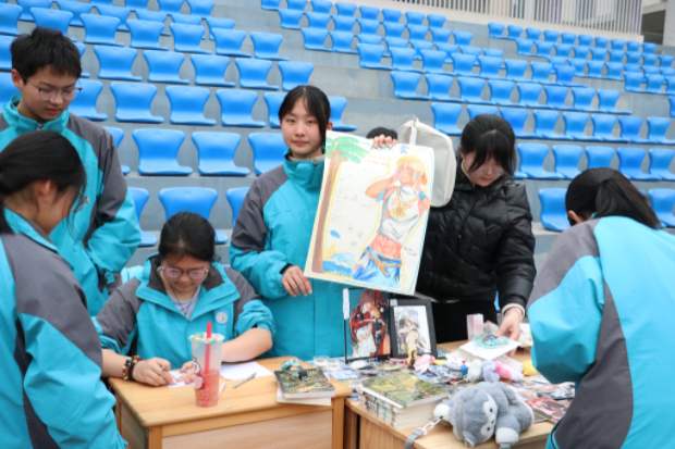放眼望去,操场上的摊位布置各具特色:有的班级制作了色彩斑斓、创意十足的海报和手绘展板;有的班级拉起了响亮的横幅;还有的同学在人群中穿梭互动,派发传单。各具特色的宣传方式,不仅展现了薛中学子丰富的想象力和创造力,更点燃了现场火热的气氛。