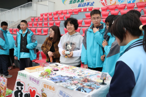 下午3点,随着广播里的一声令下,校级爱心义卖正式拉开帷幕。操场瞬间变成了一个热闹的“大型集市”。七、八年级共33个班级摊位整齐排列,形成了一道独特的风景线。
