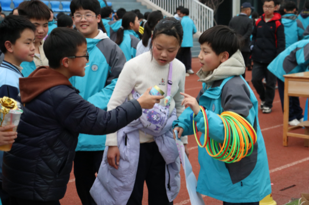 “售货员”们热情高涨,使出浑身解数推销商品;“收银员”们一丝不苟,仔细清点着每一笔善款;“保洁员”们则随时保持着摊位周边的卫生。为了招揽生意,同学们各显神通:有的摊位设置了趣味横生的套圈游戏,有的摆出了考验技巧的投壶和射箭体验,还有的推出了抽奖活动,吸引了大批“顾客”驻足参与。新颖的互动形式让义卖现场高潮迭起,欢声笑语不断。