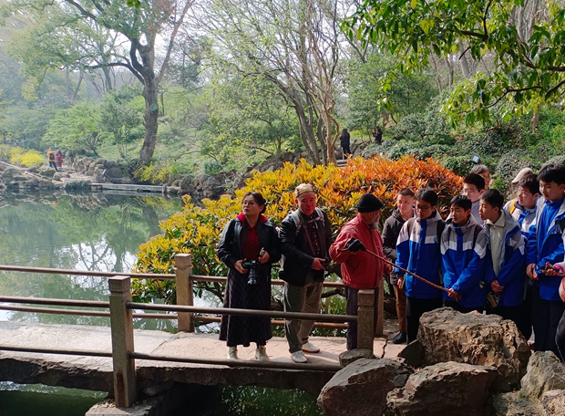 古桥边,头戴乌毡帽的耄耋老人张镜清在给素不相识的滨江中学学子讲解寄畅园鲜为人知的一段历史。时而是中气十足的普通话,时而是半懂不懂的无锡方言,不仅令同学们惊叹连连,而且吸引了路过的八方来客……