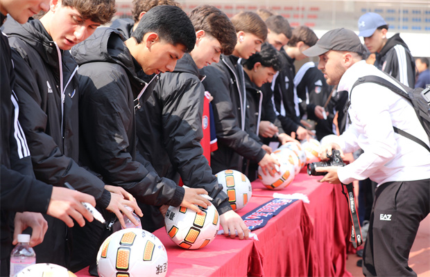 上午 10 点,交流活动在温馨有趣的破冰环节正式开启。签名墙前,中外球员纷纷提笔留下名字,一张张笑脸定格在镜头中,成为友谊的美好开端。我校学子提前精心准备了个人 “名片配对卡”,外籍球员随机抽取卡片完成结对,一对一、一对多的搭配方式,让不同年龄、不同国籍的孩子快速熟悉彼此。