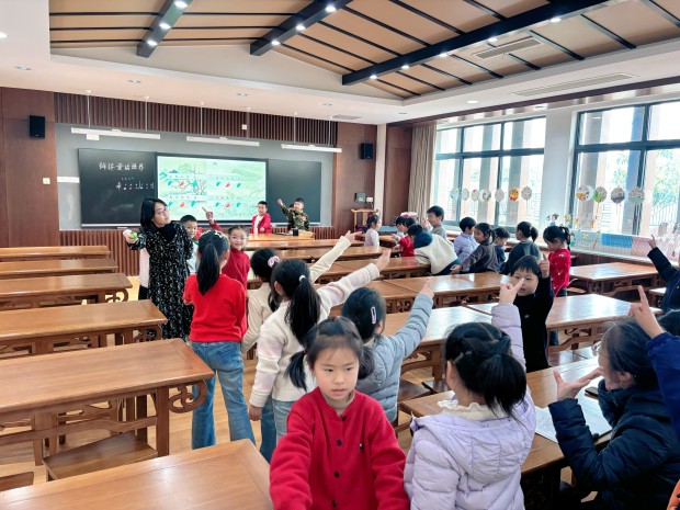 教学过程中,王丽老师摒弃单一的知识讲授,以多样化互动形式落实 “做中学、玩中学”,突破教学难点。从邀请学生上台指读节奏与旋律,到用手势模拟音符高低、踏着脚步感知节奏,再到听音符辨旋律的趣味环节,层层递进的设计让学生在动觉体验中理解长音、休止符等音乐知识,将抽象的乐理知识直观化、趣味化。这不仅契合低段学生的学习规律,更践行了跨学科学习 “实践性、探究性、开放性” 的特点,让学生在多元体验中感受诗词与音乐的融合之美,在潜移默化中接受审美熏陶,实现 “寓教于乐、以美育人” 的教学追求,充分彰显了扎实的教学功底与精巧的课堂设计能力。