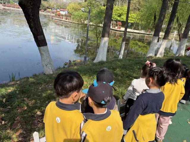 到达公园后,孩子们在春日的暖阳下,开启了丰富的自然探索活动。他们分组寻找春天的痕迹:观察树木冒出的嫩嫩新芽,辨认公园里五颜六色的花朵,追逐飞舞的小蝴蝶和小蜜蜂,捡拾形状各异的落叶和树枝,用自己的感官全方位感受春天的变化。孩子们好奇地提问、热烈地讨论,在自主探索中认识了多种春天的植物与小生物,解锁了季节的秘密。
