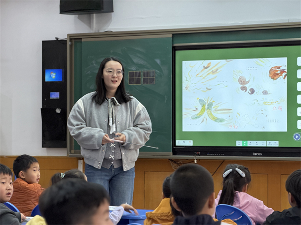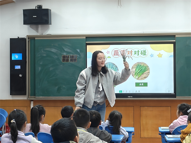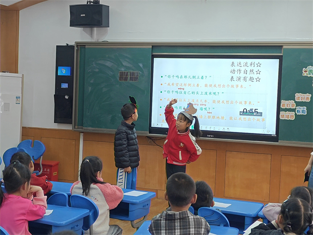 万雨晴老师执教《一园青菜成了精》,万老师围绕“质疑封面、品读童谣、演绎故事”三大任务展开教学,组织学生角色扮演“两军对垒”,并以京剧配乐朗读、创编故事收尾,学生在有趣的情境中实现玩中学。