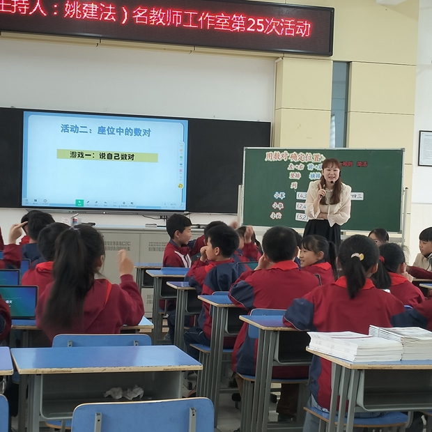 姚飞月老师执教《用数对确定位置》,以真实情境“苏超” 激趣,以学校足球联赛引思,借“同一位置不同描述” 的图像表征冲突和言语表征矛盾,引导学生感知统一规则的必要性,自然引出列、行概念。通过自主简化表达、对比辨析,让学生亲历数对符号创造过程,理解数对的有序、确定、唯一特性,并结合影院座位、经纬度等生活场景,强化数学应用意识。