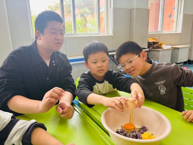 “紫藤花不仅好看,还能做成美味的花饼哦!”伴随着老师的讲解,普特共做紫藤花饼活动正式拉开帷幕。空气中弥漫着紫藤花的清香与面粉的麦香,桌上摆放着新鲜采摘、洗净沥干的紫藤花,以及面粉、鸡蛋、香油、白糖等食材,普教学生和特教学生在老师的带领下,一步步还原着古籍中记载的应时美味。
