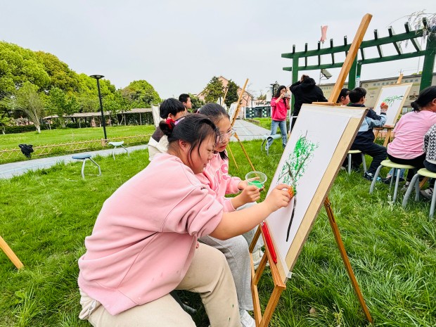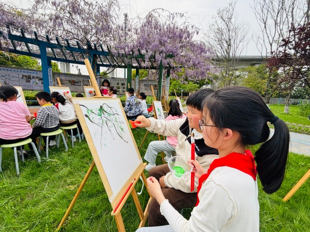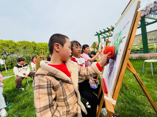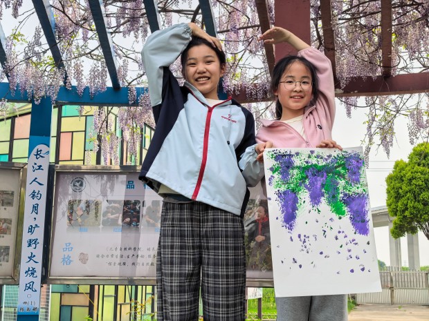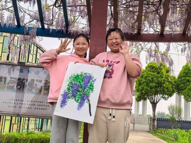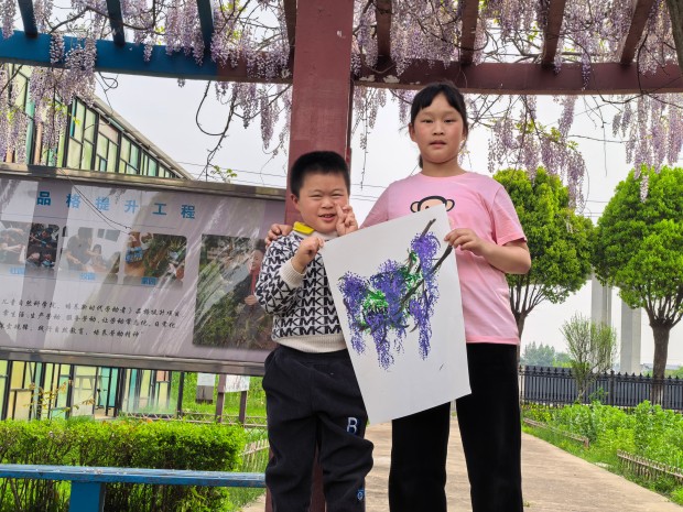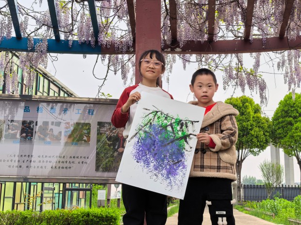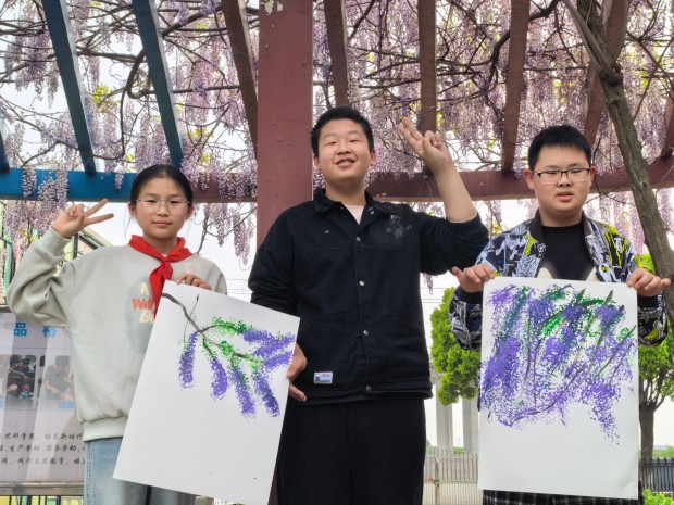 孩子们发挥想象,用指尖点染色彩,用画笔勾勒藤蔓。一笔一画,皆是心意;一涂一染,满是温情。原本略显羞涩的特教学生,在同伴的鼓励下渐渐放开手脚,脸上露出了自信的笑容。当一幅幅色彩斑斓的紫藤花画作完成,孩子们相互展示、彼此称赞,每一幅作品都承载着他们的友谊与对美的向往,也绘就了普特融合的美好画卷。