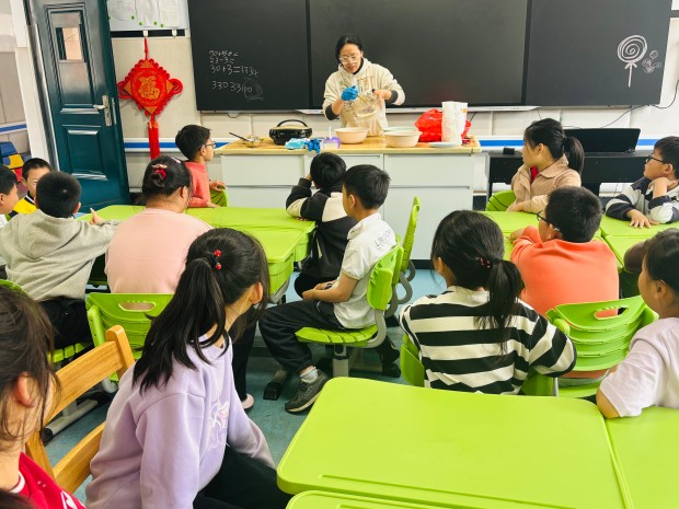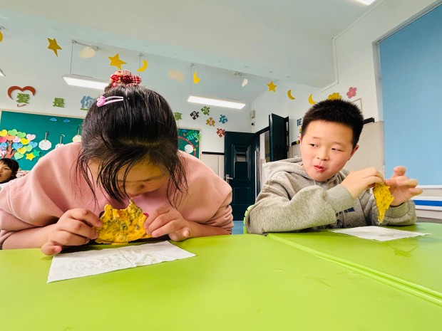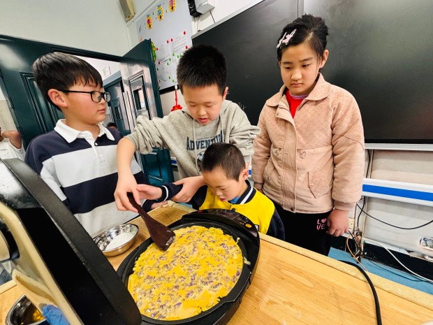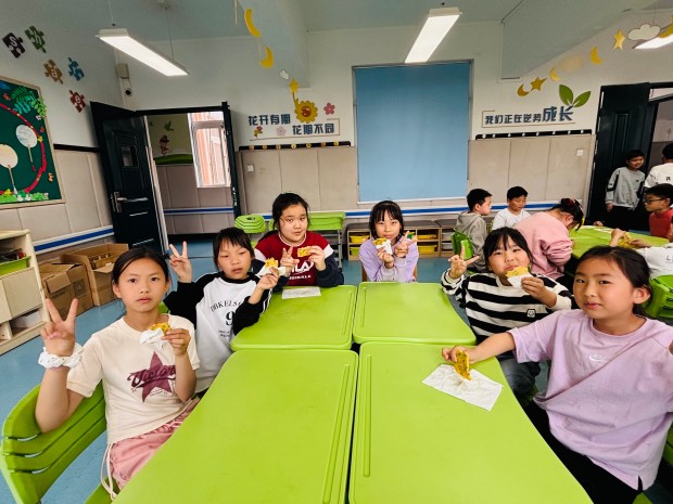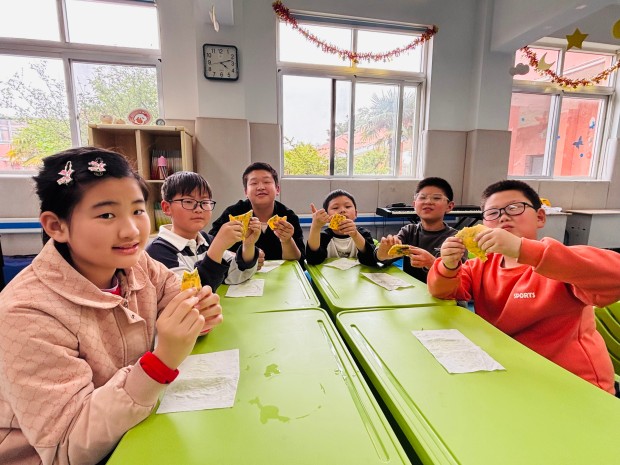 当一个个金黄酥脆的紫藤花饼出锅,香气四溢,孩子们迫不及待地品尝着自己的劳动成果。酥软柔韧的饼皮中夹杂着淡淡的紫藤花香,清咸透鲜、油润不腻,每一口都充满了幸福的味道。大家围坐在一起,分享着美食,交流着制作过程中的趣事,欢声笑语回荡在活动现场。这场烟火之约,不仅让孩子们感受到了传统美食的魅力,更在分工协作、分享美食中,拉近了彼此的距离,让温暖与包容在烟火气中悄然传递。