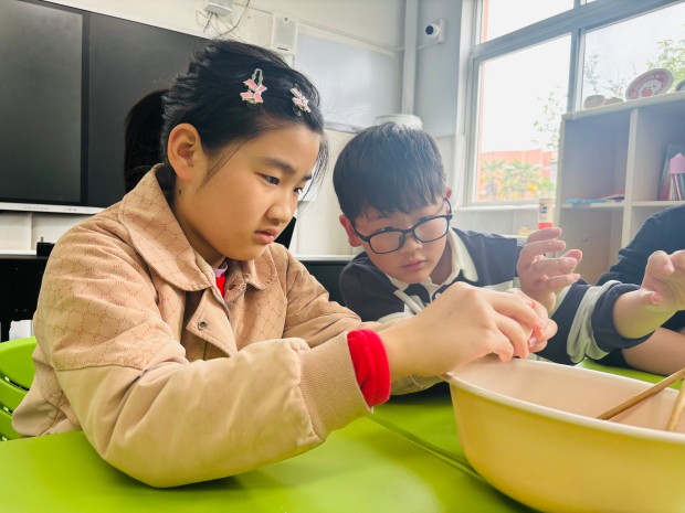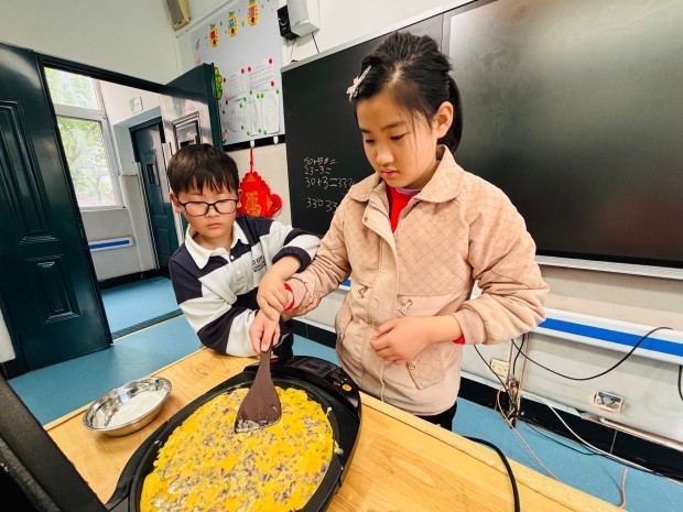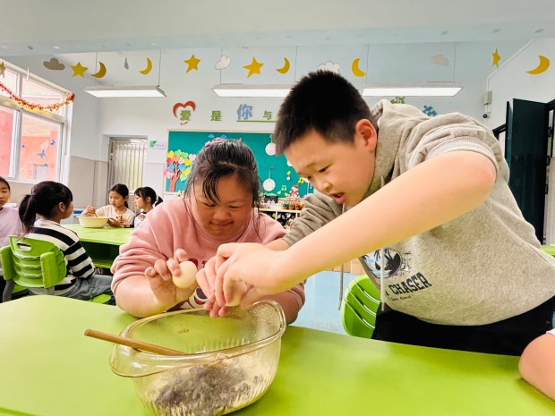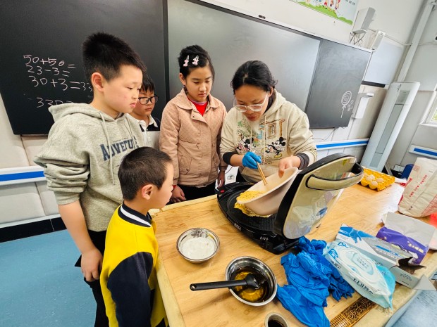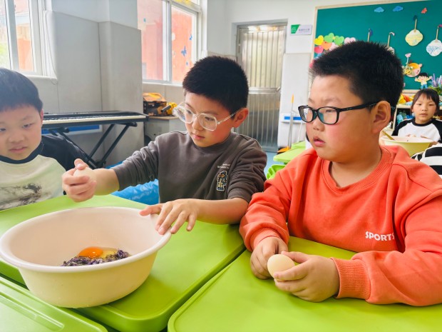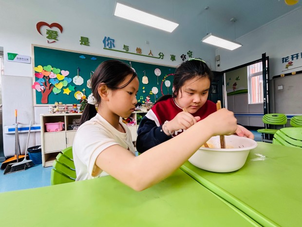 老师们先示范了紫藤花饼的制作步骤:将紫藤花焯水去涩、挤干水分,与面粉、鸡蛋等调料搅拌均匀,再放入热油锅中煎至两面金黄。随后,孩子们分组合作,普教学生负责搅拌面糊、控制火候,细心地教特教学生如何制作面糊、放入花馅;特教学生则认真学习,努力模仿,虽然动作略显生涩,但每一步都格外认真。有的孩子不小心把面糊沾到手上,同伴们主动帮忙擦拭;有的孩子掌握不好火候,伙伴们耐心提醒调整。
