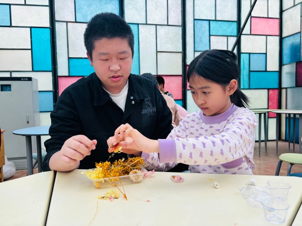 合作环节中,普教学生主动承担起调胶、搅拌的任务,按照3:1的重量比精准配比滴胶,顺时针缓慢搅拌至无丝状物透明状态;特教学生则在同伴的协助下,小心翼翼地挑选心仪的干花,轻轻放入模具中,用镊子调整花的姿态,让每一朵花都展现出最美的模样。整个过程中,孩子们分工协作、互帮互助,耐心等待滴胶凝固,期待着属于他们的专属作品。