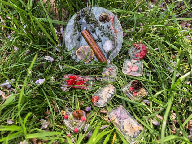 “我们把晒干的紫藤花放进模具里,再倒入调好的滴胶,等它凝固就好啦!”孩子们化身“小小手艺人”,开启了滴胶干花的制作之旅。桌上摆放着提前压制好的干花、水晶滴胶、模具、搅拌棒等材料,老师详细讲解了滴胶的配比、搅拌方法以及干花的摆放技巧,着重强调了制作过程中的安全注意事项。