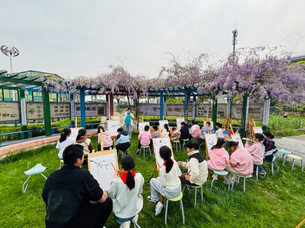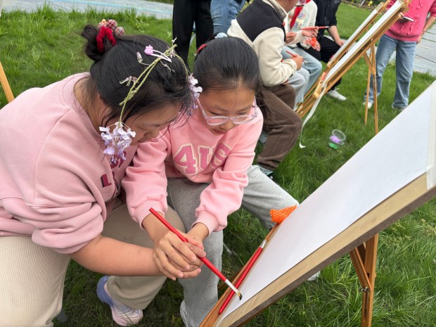 “你看,紫藤花是一串一串的,紫中带白,像小铃铛一样。”活动现场,普教学生握着特教学生的手,耐心地讲解着紫藤花的形态与色彩。老师们温柔引导,鼓励特教学生大胆下笔,普教学生则主动分享绘画技巧,有的帮忙蘸取颜料,有的协助勾勒花藤,有的耐心纠正笔触,没有丝毫隔阂与生疏。